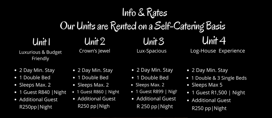 Our standard rate covers one guest per unit, per night. Each additional guest adds a R250 per night (sharing) for lower seasons and up to R500 during high seasons, keeping your stay affordable and flexible. * 2 Minimum Stay Policy applies at these Affordable, Luxurious Self-Catering units in George