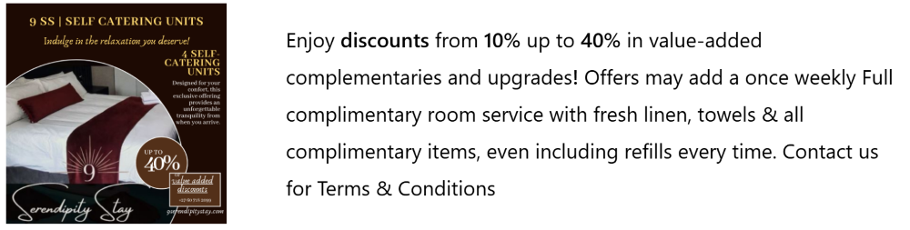 See what our guests are saying about their stay at 9 Serendipity from Real guests, Real stays, Real online feedback Google | Booking.com | Lekkeslaap Planet of Hotels